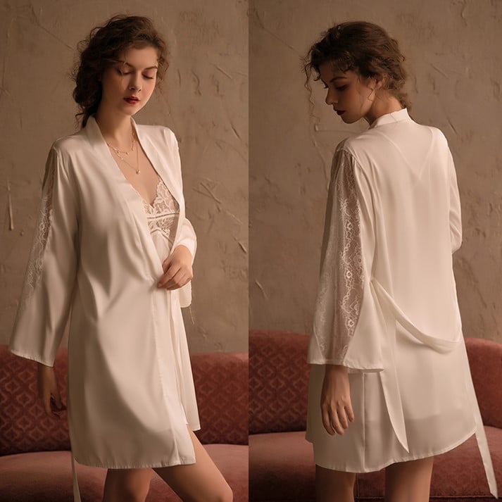 Ce bel ensemble déshabillé blanc à manche dentelle vous enrobe de douceur. Ajoutez une touche romantique à votre quotidien !